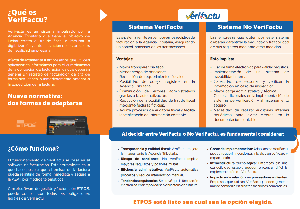 ETPOS es una solución de facturación que cumple con VeriFactu, permitiendo generar facturas en el formato requerido por la AEAT y gestionar el proceso completo de emisión y validación.